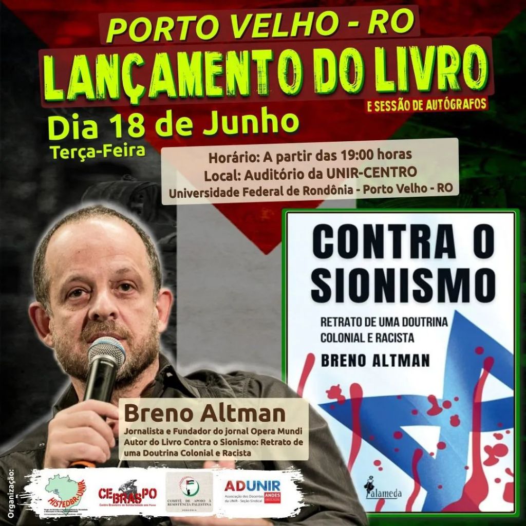 Durante o evento, será lançado o livro de Breno Altman, “Contra o Sionismo: Retrato de uma doutrina colonial e racista“, seguido de uma sessão pública de autógrafos com o autor.