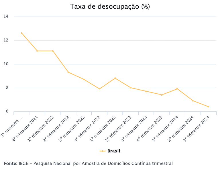 A taxa de desocupação no terceiro trimestre de 2024 caiu para 6,4%, de acordo com os dados da Pesquisa Nacional por Amostra de Domicílios (PNAD) Contínua, divulgada pelo IBGE na última sexta-feira, 22 de novembro.