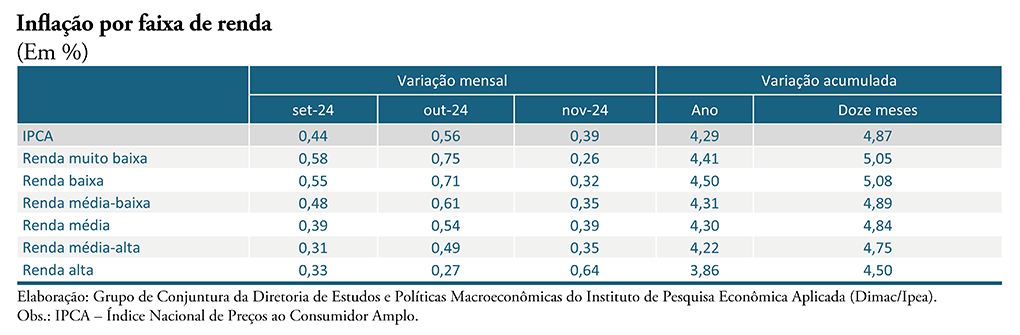 Na comparação com novembro de 2023, os dados mostram que houve aceleração da inflação corrente para todas as faixas de renda, com pressão inflacionária mais intensa para os segmentos de renda média.