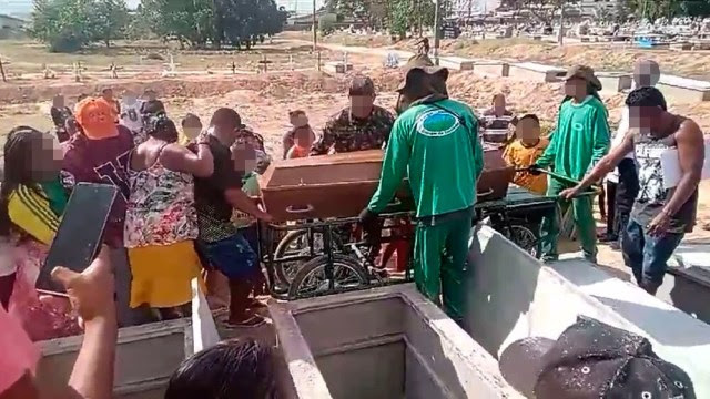 Três dos sete filhos do casal se aproximaram da urna funerária assim que ela foi posicionada em um espaço destinado à celebração da memória de Matos. Um deles clamava pelo pai morto enquanto segurava a borda do caixão.
