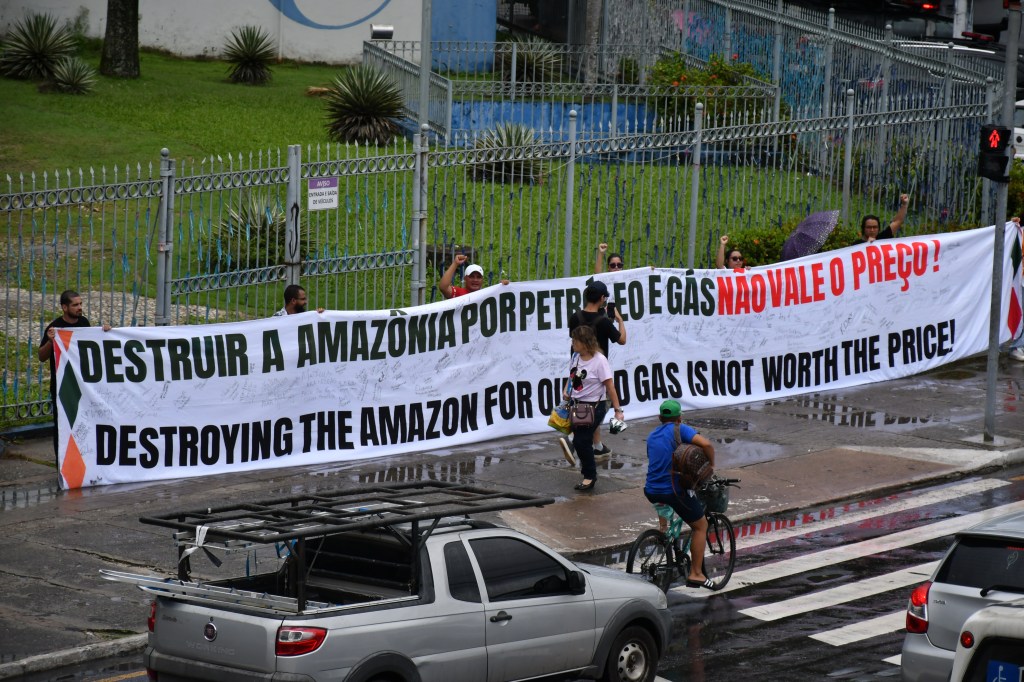 “Destruir a Amazônia por petróleo e gás não vale o preço”, dizia a mensagem de uma faixa colocada no local do protesto, que aconteceu em frente da obra finalizada e destinada a COP30, conferência internacional de mudanças climáticas na ONU, onde o Brasil desempenha um papel fundamental em liderar processos internacionais por ações concretas de redução de carbono e pela transição energética justa.