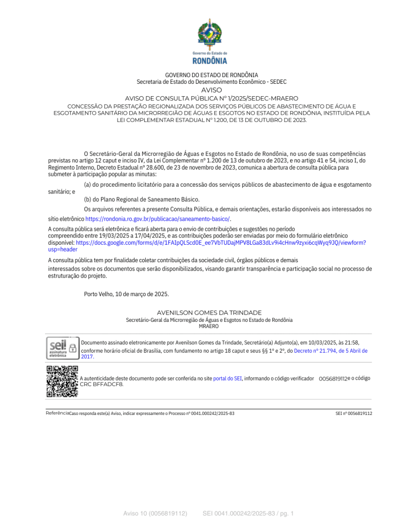 Em 10 de março, o Governo do Estado de Rondônia, por meio da Secretaria de Estado do Desenvolvimento Econômico (SEDEC), anunciou a abertura de uma consulta pública para discutir a concessão dos serviços de abastecimento de água e esgotamento sanitário no estado.
