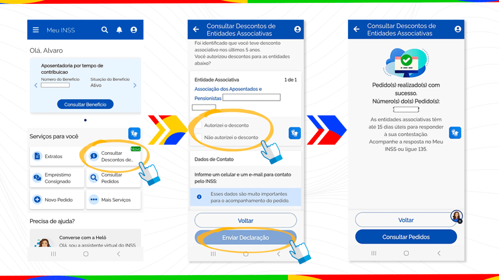 A partir desta quarta-feira, 14 de maio, é possível confirmar se o desconto associativo identificado em seu benefício foi autorizado ou não. Basta acessar o aplicativo ou o site Meu INSS, com seu CPF e senha e clicar no serviço “Consultar Descontos de Entidades Associativas”.