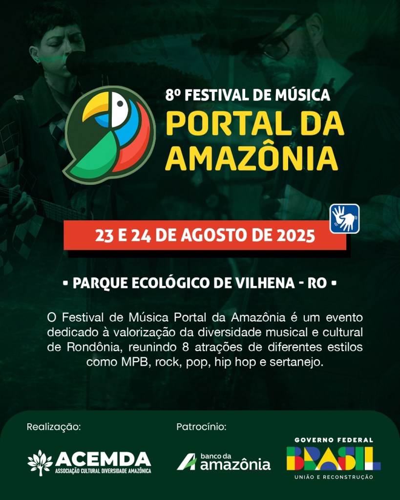 Neste sábado (23) e domingo (24), a partir das 15h, o Parque Ecológico de Vilhena recebe a 8ª edição do Festival de Música Portal da Amazônia, que promete dois dias de programação gratuita e diversificada.