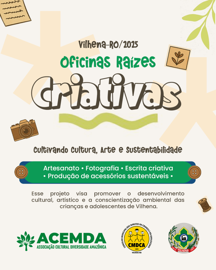 A Associação Cultural, Educação, Meio Ambiente e Desenvolvimento Sustentável Diversidade Amazônica (ACEMDA) promove, neste mês o projeto “Oficinas Raízes Criativas: Cultivando Cultura, Arte e Sustentabilidade”, que oferecerá gratuitamente quatro oficinas culturais voltadas para crianças e adolescentes alunos da Escola Professor Luiz Carlos Paula Assis, em Vilhena.