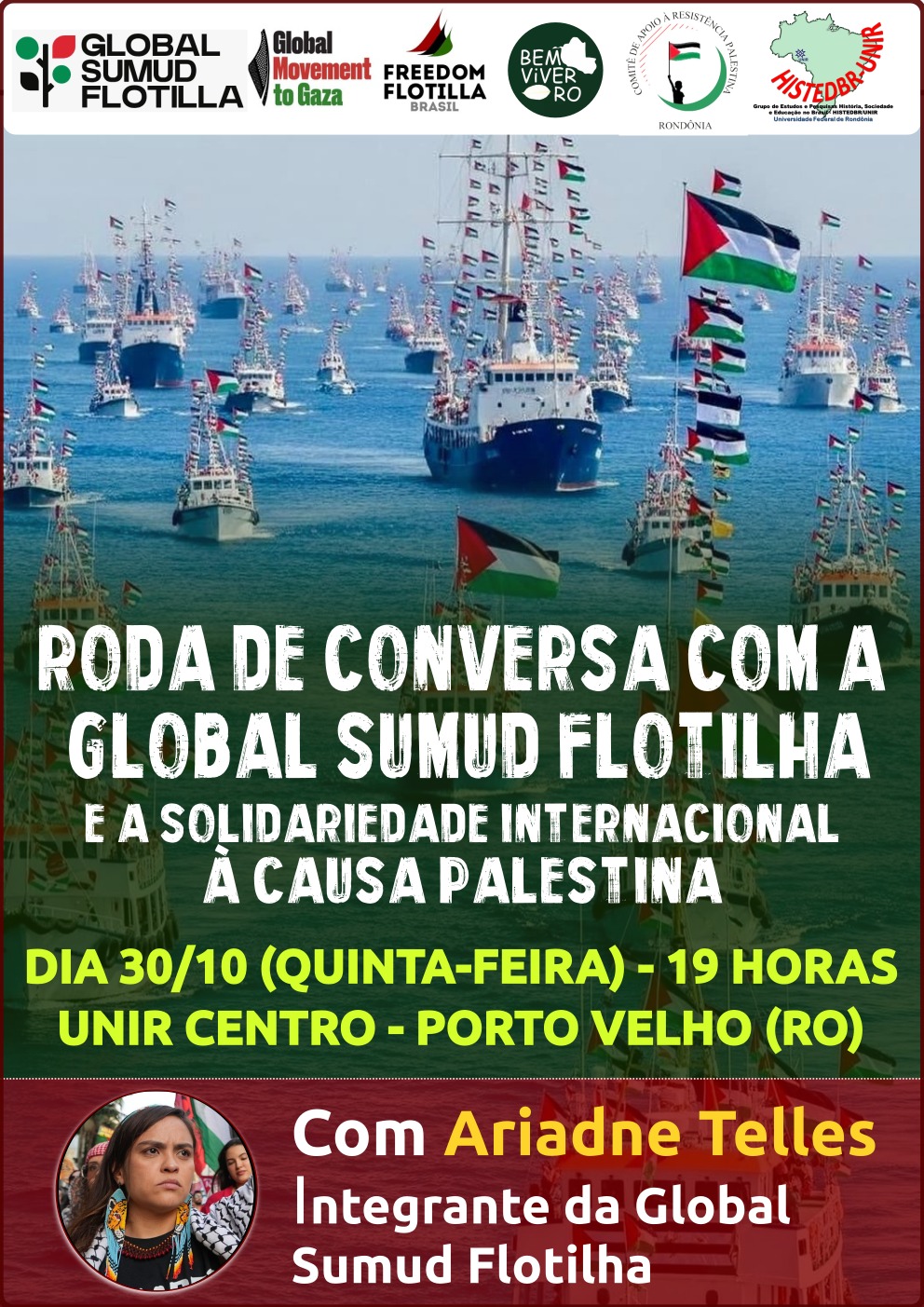 Nesta quinta-feira (30), no auditório da Universidade Federal de Rondônia – Campus Centro, em Porto Velho, acontece uma roda de conversa que discutirá violações de direitos na Faixa de Gaza e a solidariedade ao povo palestino. O evento contará com a presença da advogada Ariadne Telles, ativista da Global Sumud Flotilla, que foi sequestrada em águas internacionais e encarcerada pelas forças armadas de “israel” por levar ajuda humanitária a civis palestinos.