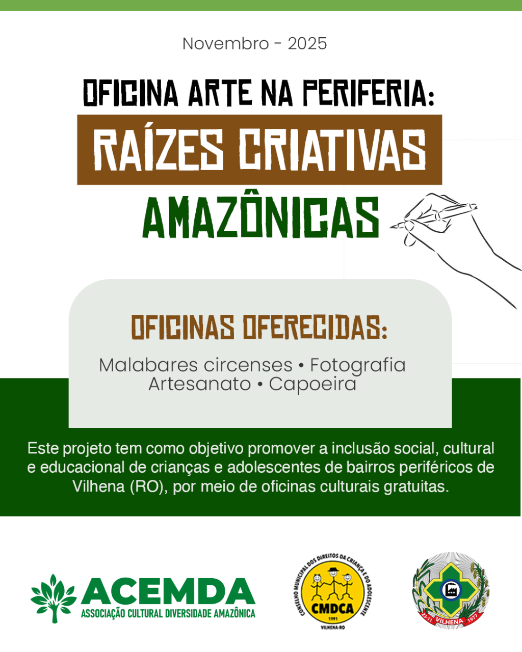 A Associação Cultural, Educação, Meio Ambiente e Desenvolvimento Sustentável Diversidade Amazônica (ACEMDA) vai promover, neste mês de novembro, o projeto “Oficina Arte na Periferia: Raízes Criativas Amazônicas”, que ofertará oficinas culturais gratuitas para cerca de 100 crianças e adolescentes da Escola Estadual Professor Luiz Carlos Paula Assis, no Setor 6 do bairro Parque São Paulo de Vilhena.