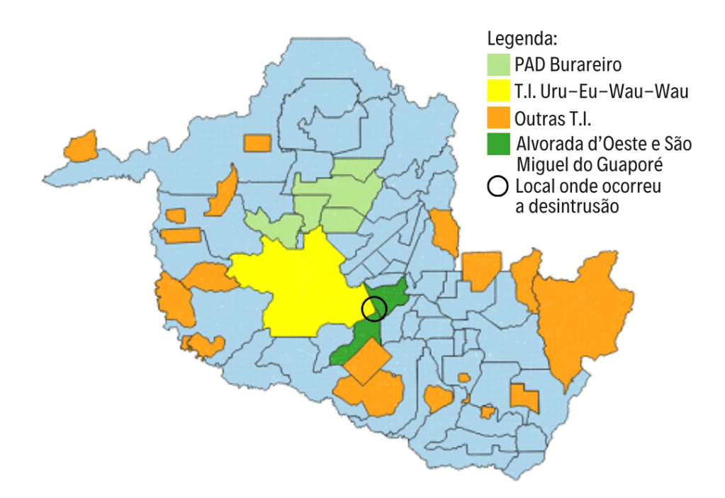 As propriedades que foram alvo da operação de desintrusão da TI Uru Eu Wau Wau não integram a área do PAD Burareiro de acordo com as coordenadas indicadas no parágrafo único do decreto 75.281, de 23 de janeiro de 1975. Seguindo as indicações do decreto, a reportagem constatou que os municípios compreendidos são: