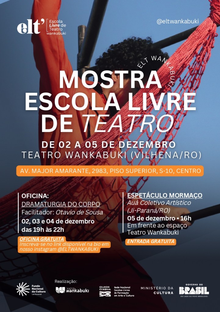 Nesta sexta-feira (5), às 16h, na Praça Ângelo Espadari, em Vilhena, a Escola Livre de Teatro Wankabuki (ELTW) recebe o espetáculo Mormaço do Coletivo Auá, de Ji-Paraná. A apresentação integra uma programação especial que inclui também a Oficina de Dramaturgia do Corpo, realizada entre os dias 02 e 04 de dezembro, no espaço do Teatro Wankabuki. A oficina propõe uma imersão prática, onde o corpo é entendido como ferramenta criativa e narrativa.