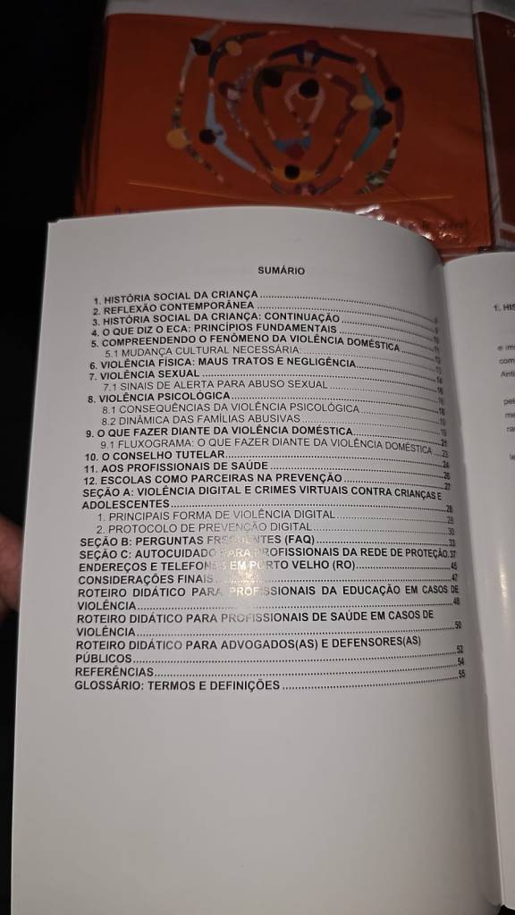 Há ainda capítulos específicos direcionados ao Conselho Tutelar, às áreas da saúde e da educação, além de uma seção dedicada à violência digital e aos crimes virtuais. O conteúdo inclui perguntas frequentes (FAQ), orientações de autocuidado para profissionais que atuam na linha de frente, endereços e telefones úteis em Porto Velho, roteiros didáticos para educação, saúde e sistema de justiça, além de glossário e referências.