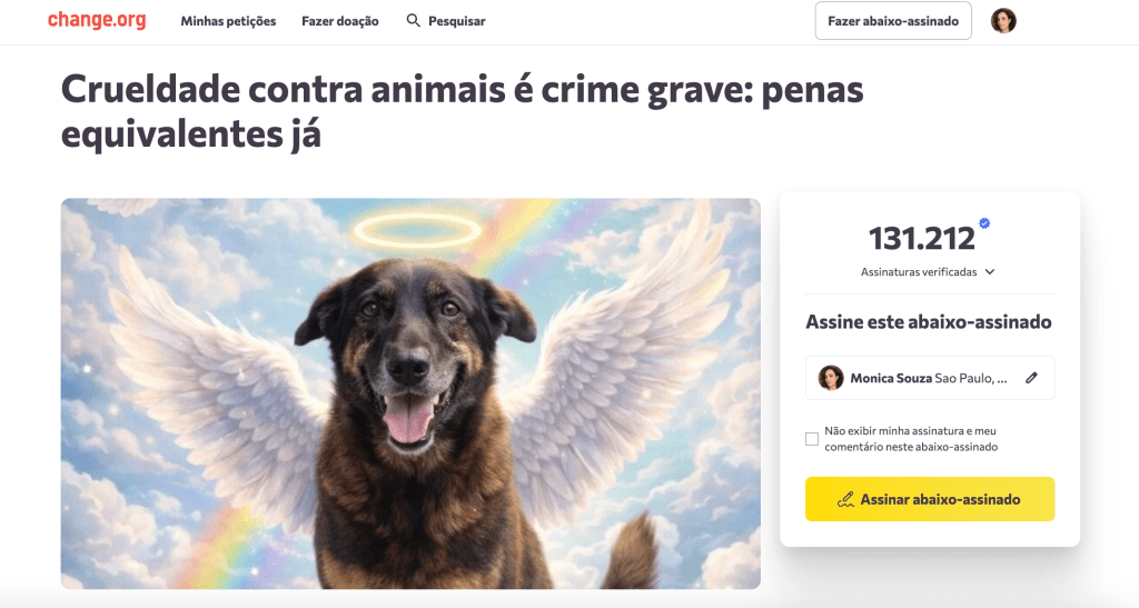 A maior das campanhas,“Crueldade contra animais é crime grave: penas equivalentes já”, criada pela organização Desafio Meio Ambiente, ultrapassa 131 mil assinaturas e defende que crimes contra animais sejam tratados com o mesmo rigor aplicado a outras formas de violência.