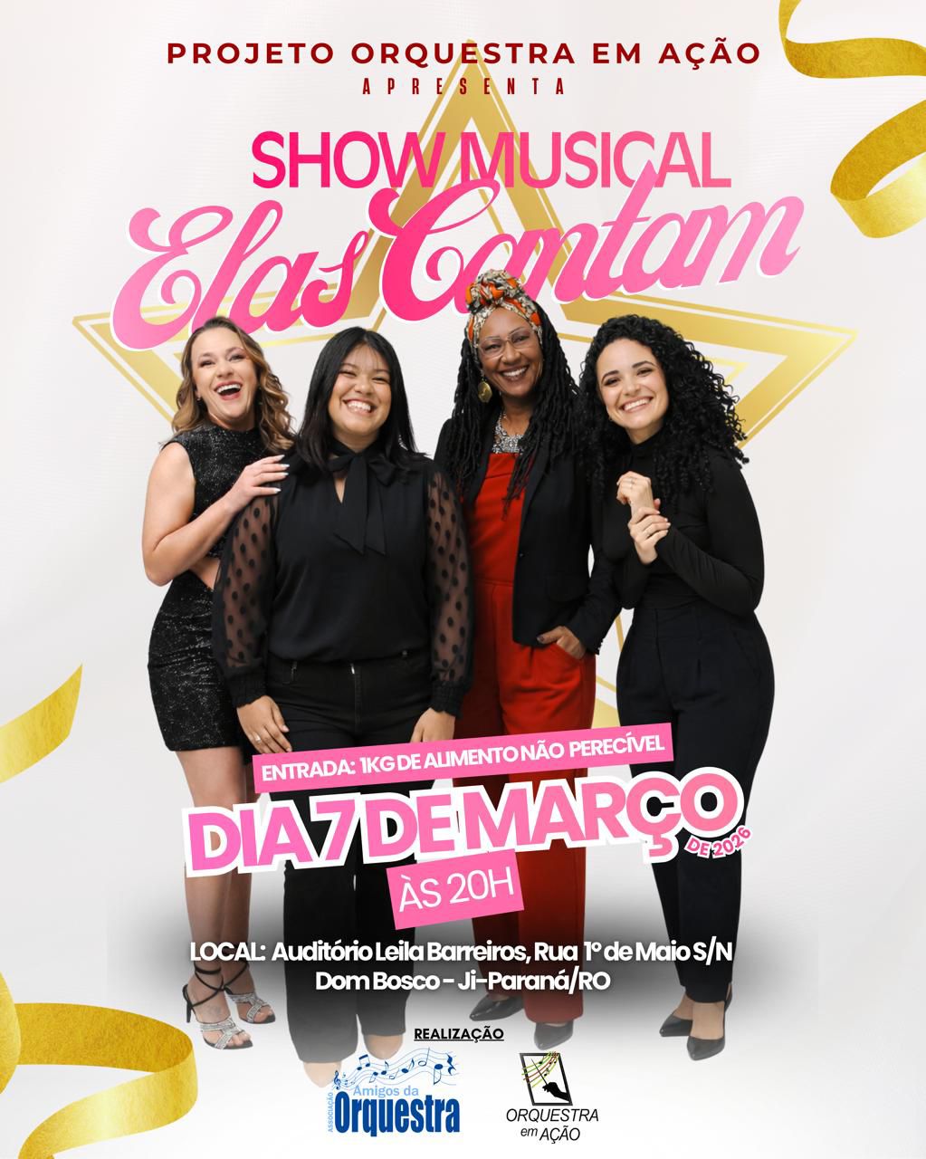 O Projeto Orquestra em Ação realiza, na noite de 7 de março, o espetáculo musical “Elas Cantam”, uma apresentação dedicada a celebrar a força e a presença feminina por meio da música. O evento acontece às 20h, no Auditório Leila Barreiros, em Ji-Paraná, e terá entrada solidária mediante a doação de 1 kg de alimento não perecível.
